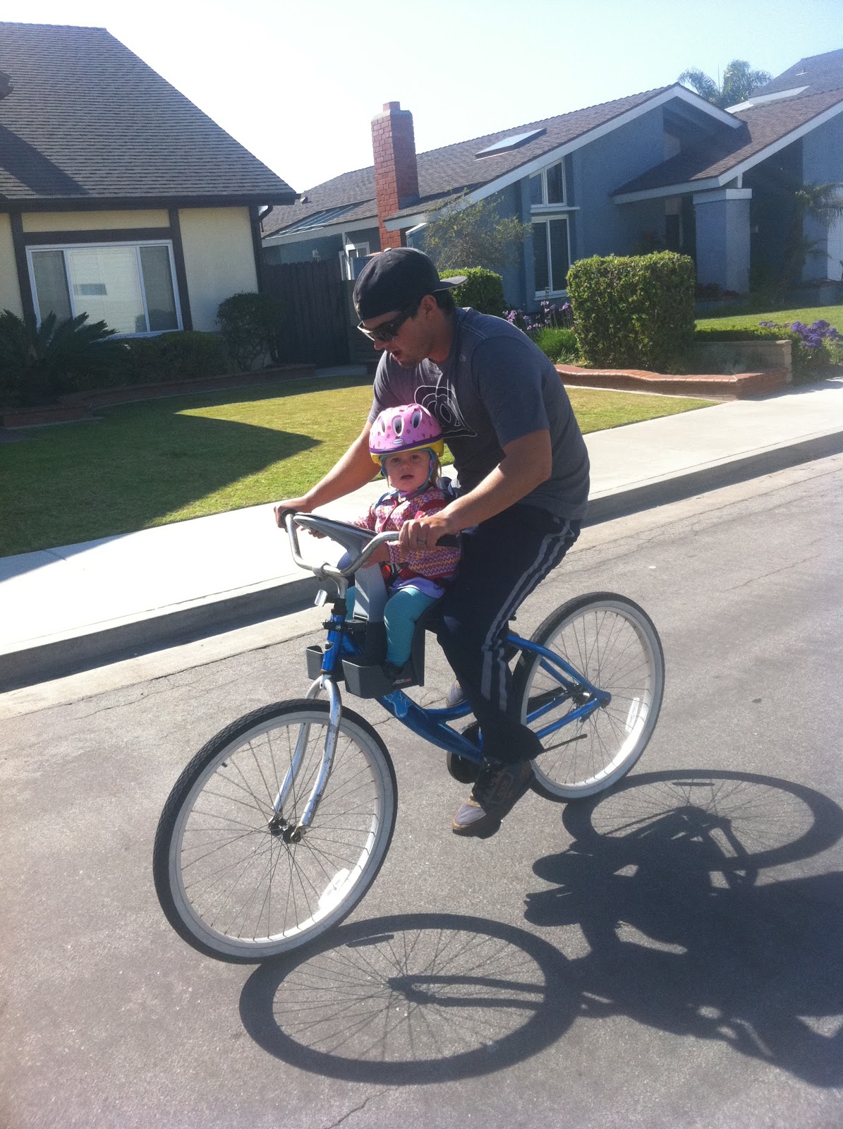This weekend called for a bike ride to the park. This was Malias first time on a bike, so Brad and I were a bit skeptical on her initial reaction to wearing a helmet, let alone riding a bike. We proceeded to show her pictures of kids wearing helmets and told her she had her very own big girls helmet to wear. Malia quickly began to warm up to the helmet and had no problem getting on the bike. Daddy started to peddle faster and faster and a watermelon smile grew on her face. She love it!
